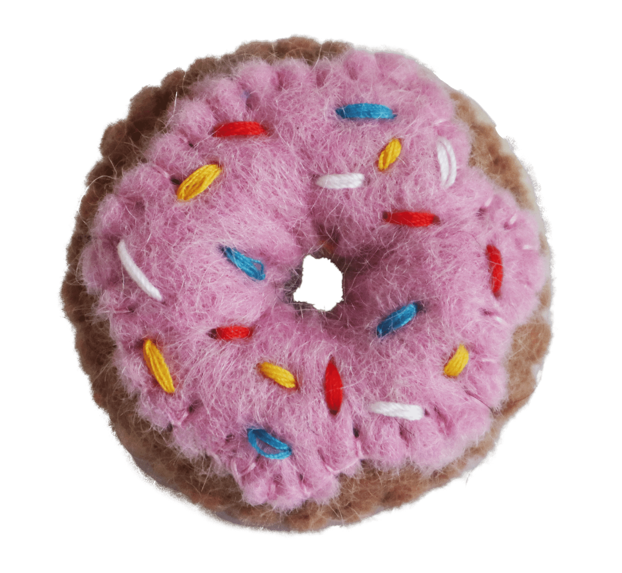 Er hat eine runde Form mit Loch in der Mitte und eine zartrosa „Glasur“ auf der Oberseite, die mit bunten Filzstreuseln verziert ist – in Gelb, Rot, Weiß und Blau. Der Donutboden ist hellbraun, was ihm ein besonders realistisches Gebäck-Aussehen verleiht.