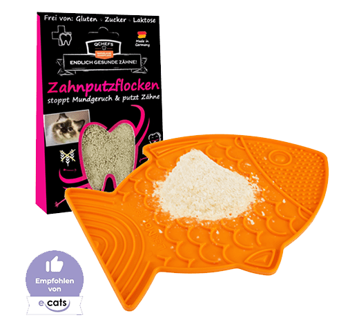 Zähneputzen mit Leidenschaft! Für die Katzenzunge sind die flachen Schuppen ideal. Es wird langsam gefuttert-besser verdaut. Es macht glücklich und entspannt. Intensives Schlecken unterstützt auch den Zahnputz- Effekt der Zahnputzflocken. Einfach über die mit Joghurt gefüllten Schuppen streuen. Gegen Zahnstein etwas Biokokos dazu. Mit langer Zunge drüber- dort sitzen 80 % der Bakterien. Natürlich antibakterielle Peptide reduzieren die Bakterien. Die Mundflora ist in Balance. Mundgeruch geht zurück. Zähne sauber- Katze entspannt- Mensch zufrieden!