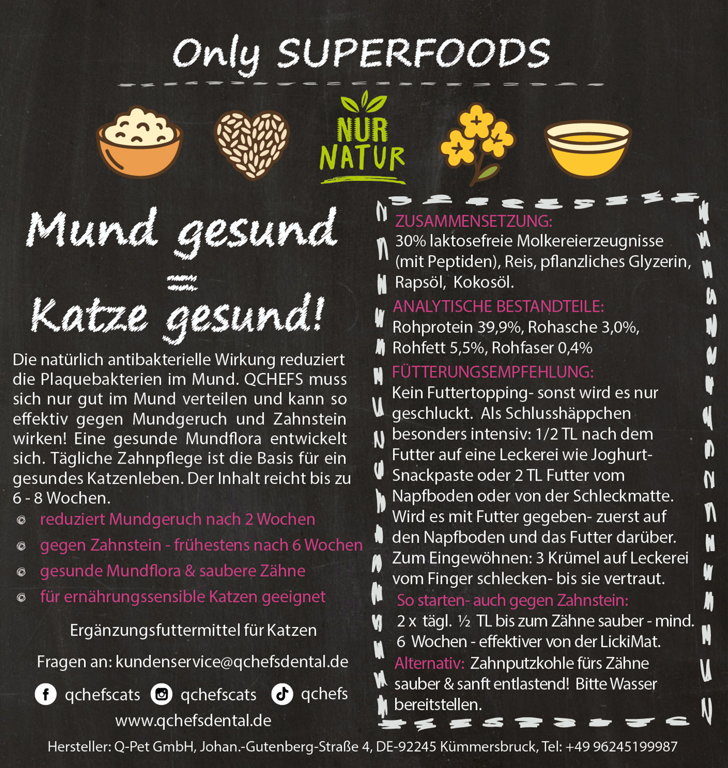 Zähneputzen mit Leidenschaft! Für die Katzenzunge sind die flachen Schuppen ideal. Es wird langsam gefuttert-besser verdaut. Es macht glücklich und entspannt. Intensives Schlecken unterstützt auch den Zahnputz- Effekt der Zahnputzflocken. Einfach über die mit Joghurt gefüllten Schuppen streuen. Gegen Zahnstein etwas Biokokos dazu. Mit langer Zunge drüber- dort sitzen 80 % der Bakterien. Natürlich antibakterielle Peptide reduzieren die Bakterien. Die Mundflora ist in Balance. Mundgeruch geht zurück. Zähne sauber- Katze entspannt- Mensch zufrieden!
