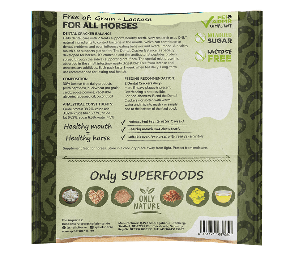 Ich kann das Produkt absolut nur empfehlen. Natürlich war ich zunächst skeptisch: Frisst mein Pferd es überhaupt? Und was bringt es? Der Geschmackstest brachte ein zufriedenes Flehmen, die Cräcker werden anstandslos genommen und mittlerweile kennt meine Stute das Ritual: Nach der Hauptmahlzeit, bevor ich den Stall verlasse, schaut sie schon erwartungsvoll aus der Box, um die 2 Kekse entgegen zu nehmen. Mittlerweile sind 6 Wochen um und als ich aus dem Urlaub zurück kam, fielen mir sofort die viel weißeren Zähne auf! Und da ich ein “Vorher”-Foto gemacht hatte und nun ein aktuelles “Nachher”-Bild nach 6 Wochen zum Vergleich habe, ist klar zu erkennen, dass die Ablagerungen und Verfärbungen sich deutlich minimiert haben! Ich werde es auf jeden Fall weiter füttern und freue mich sehr, dieses Produkt gefunden zu haben, um präventiv die Zahnpflege meines Pferdes zu unterstützen.