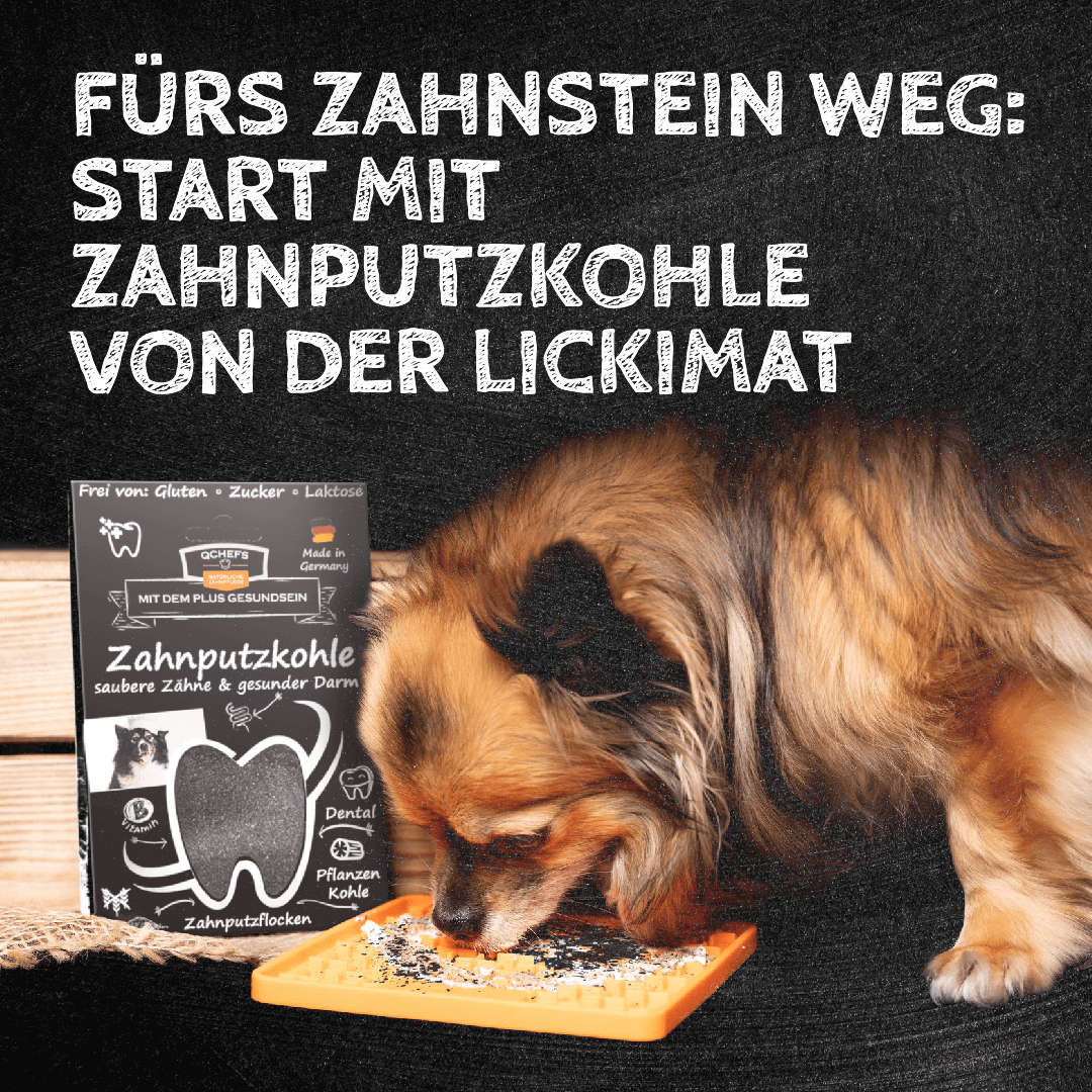Zahnputzkohle von QCHEFS auf der Lickimat – natürliche Zahnpflege für Hunde gegen Zahnstein und Mundgeruch – gesunde Zähne und sauberes Zahnfleisch.